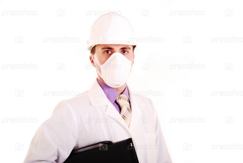 Мужчина в строительной каске и в респираторе