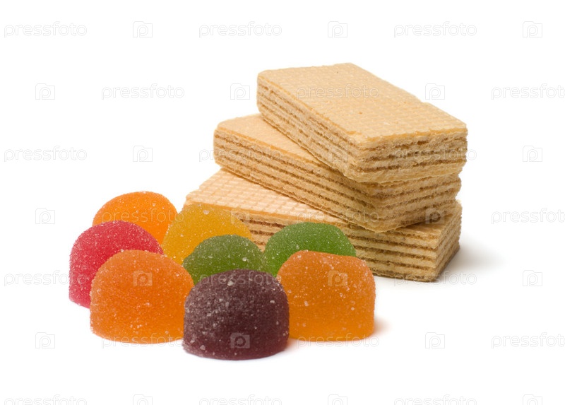 Разноцветный мармелад и вафли на белом фоне
