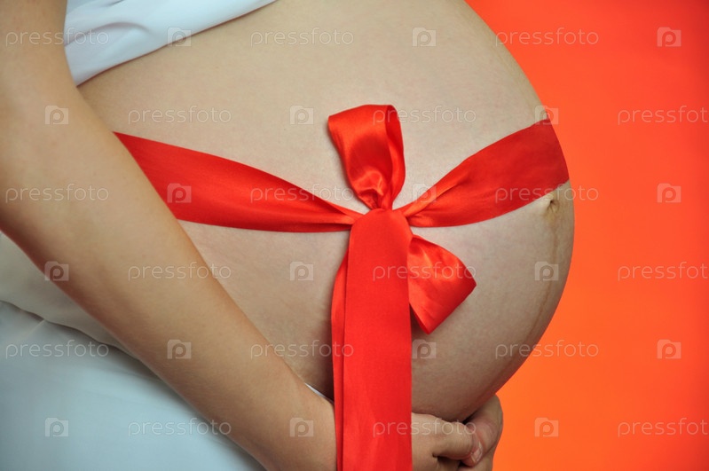Живот беременной женщины с красным бантиком