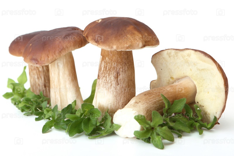 Четыре белых гриба на белом фоне
