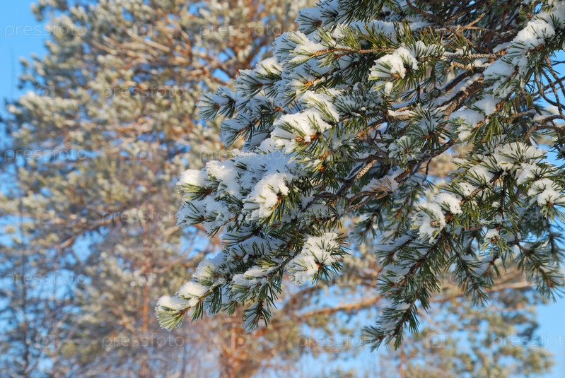 Снег на сосне в лучах восходящего солнца