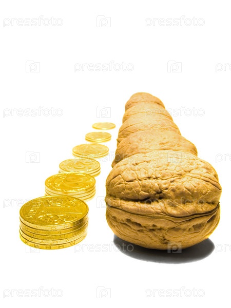 Монеты и грецкие орехи на белом фоне