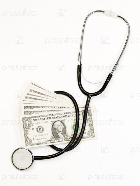 Американские доллары и стетоскоп на светлом фоне