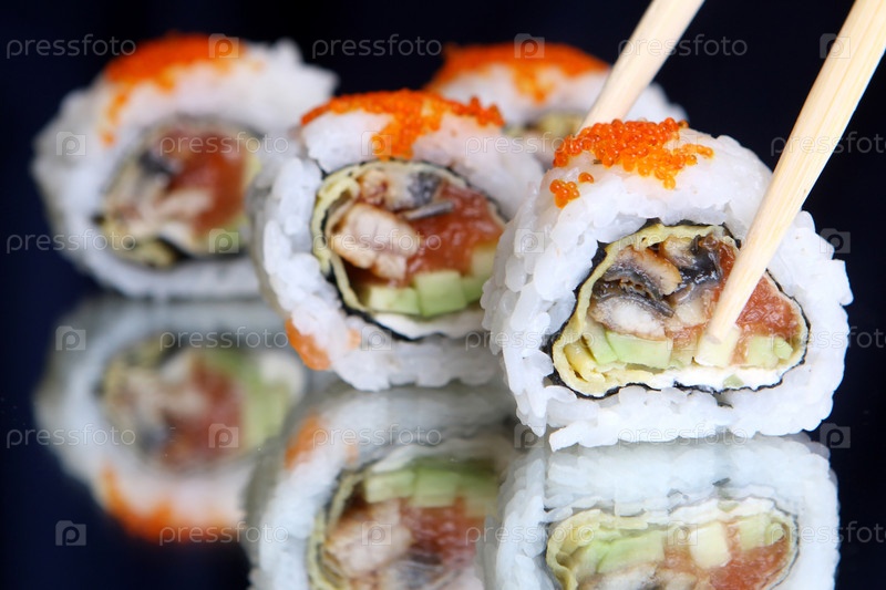 Маки суши с икрой на черном фоне