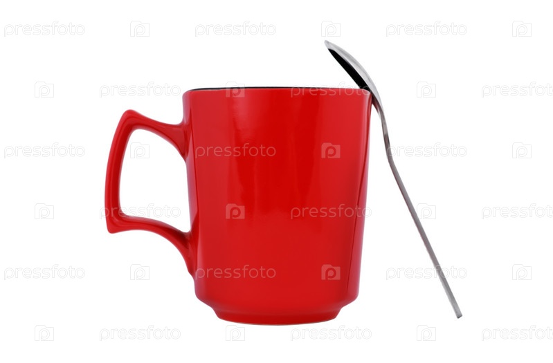 Красная кружка с ложкой крупным планом. Изоляция на белом фоне
