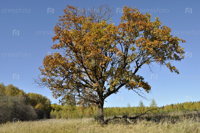 Старый дуб на опушке леса в осенний день