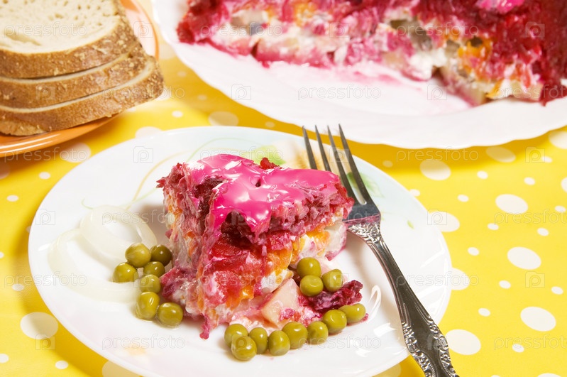 Салат "Селедка под шубой" на тарелке с консервированным горошком