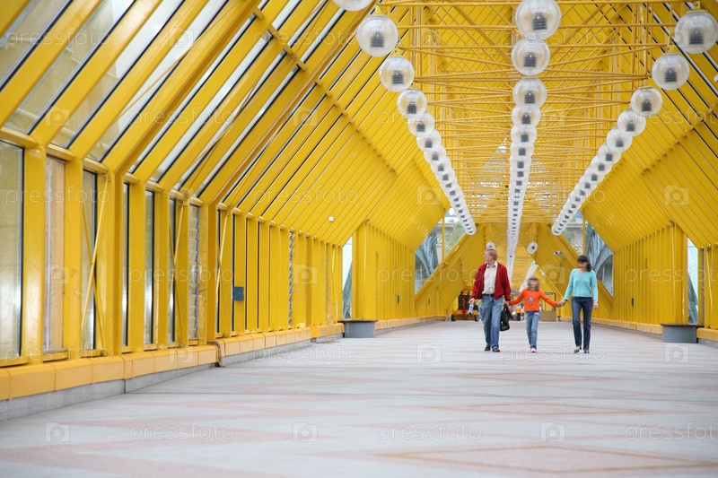 Пешеходы идут по крытому мосту