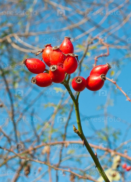 Плоды шиповника на фоне голубого неба