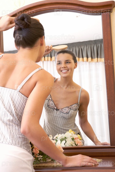 Девушка расчесывает волосы перед зеркалом