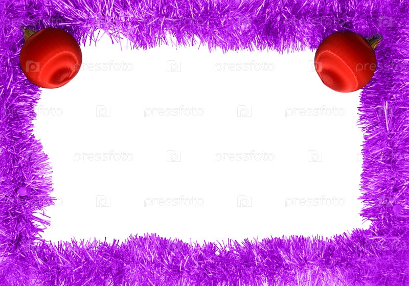 Новогодняя рамка из фиолетовой мишуры и красного новогодних шаров