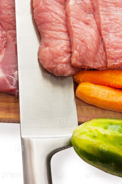 Нарезанные мясо и овощи на разделочной доске