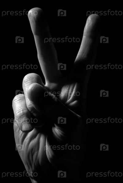 Мужская рука показывает знак "Победа". Черно-белое фото. Серия