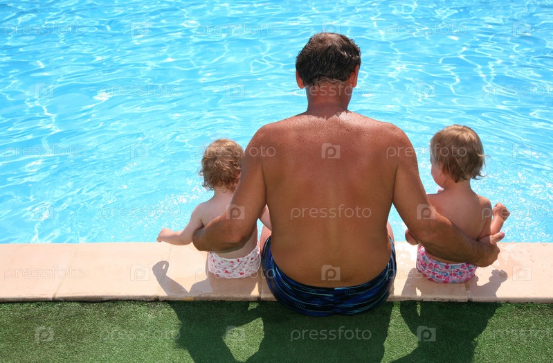 Дедушка с внучками отдыхают у бассейна