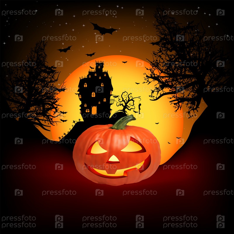 Тыква для Хеллоуина на фоне луны и дома на холме