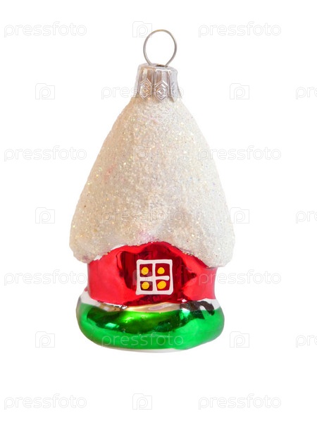 Новогодняя игрушка в виде домика, изолированная на белом фоне. Крупный план