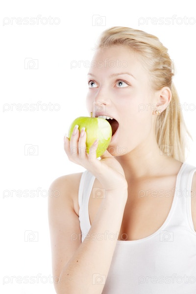 Молодая блондинка ест яблоко