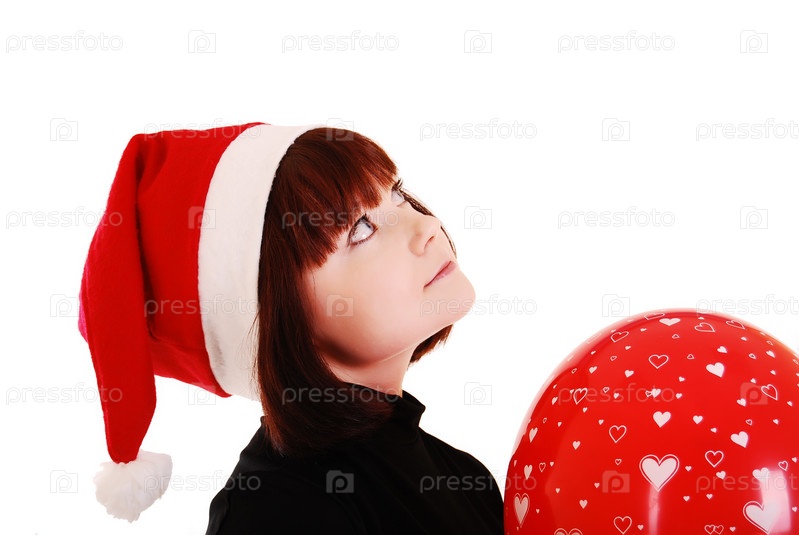 Женщина в колпаке Санта Клауса с красным воздушным шариком