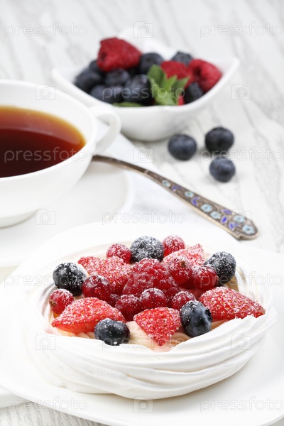 Фруктовый десерт, чай и свежие ягоды на белой поверхности