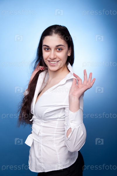Портрет молодой девушки на голубом фоне