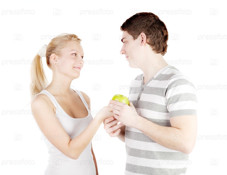 Молодая пара с яблоком на белом фоне