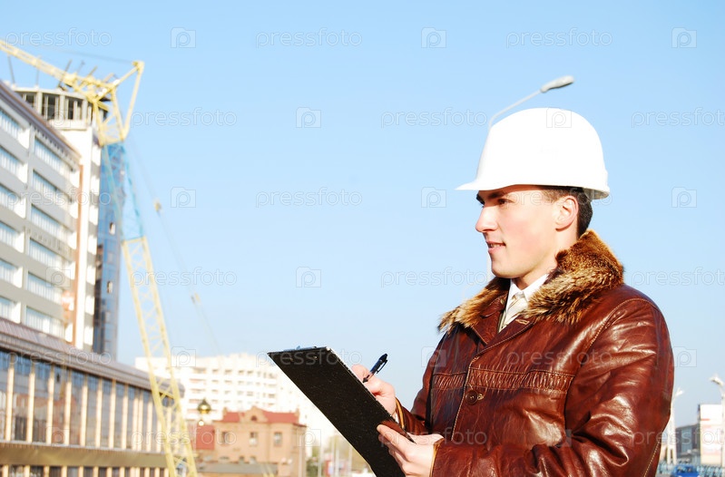 Инженер-строитель в каске с документами в руках