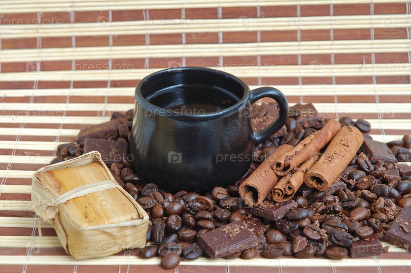 Небольшая коричневая чашка и пролитые кофейные бобы на бамбуковом подстилке