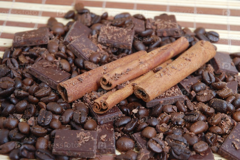 Пролитые кофейные бобы с корицей и шоколадом на бамбуковом фоне