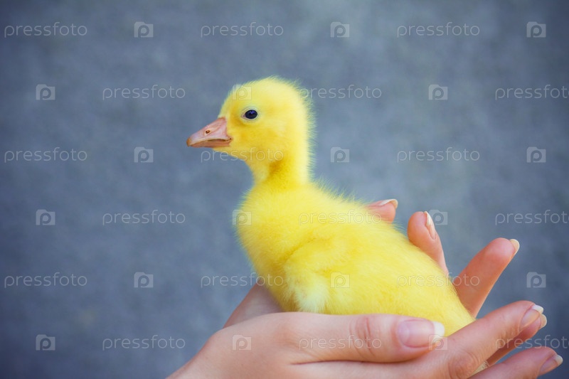 Утенок в женских руках на сером фоне