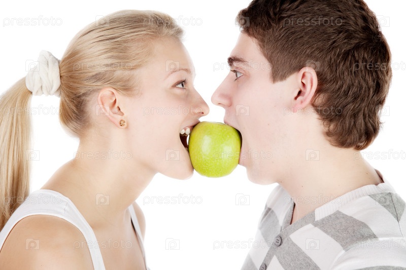 Молодая пара с яблоком на белом фоне