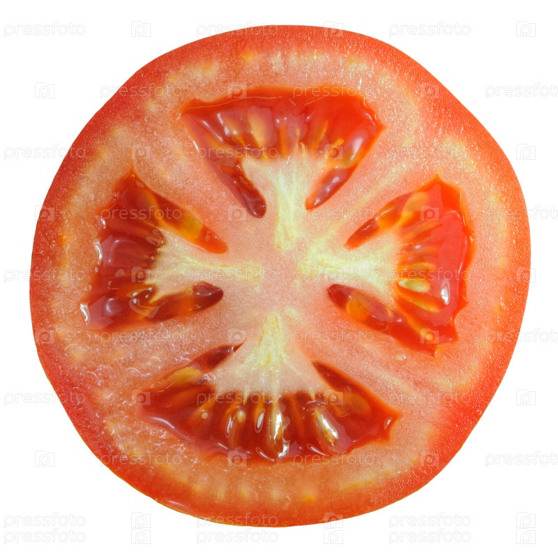 Круглый кусок помидора крупным планом, изолированный на белом фоне