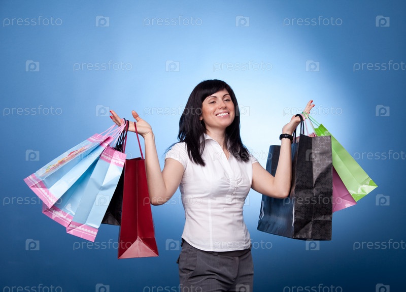 Молодая красивая девушка с покупками на голубом фоне