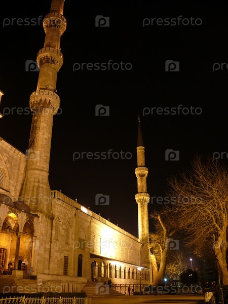 Каменные башни мечети на фоне ночного неба