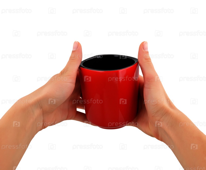 Красная чашка в руках на белом фоне