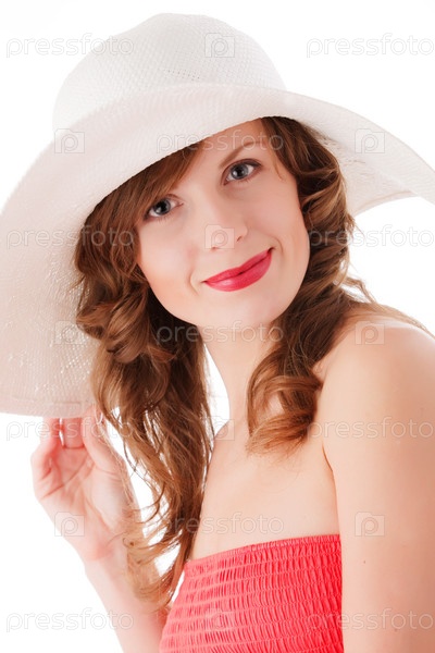 Романтическая молодая женщина в белой соломенной шляпе