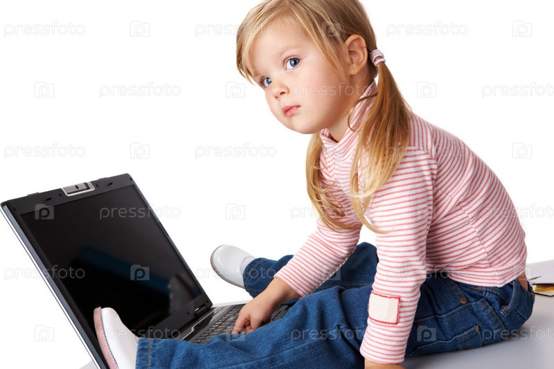 Маленький ребенок за ноутбуком на белом фоне