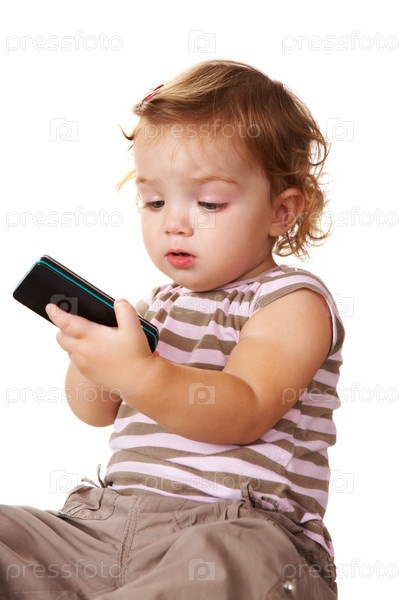 Маленький ребенок с сотовым телефоном на белом фоне