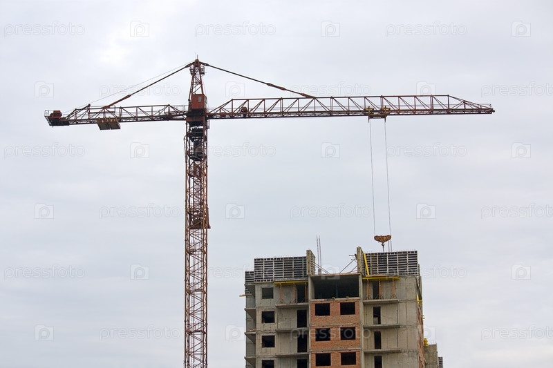 Башенный кран возле строящегося дома на фоне облачного неба
