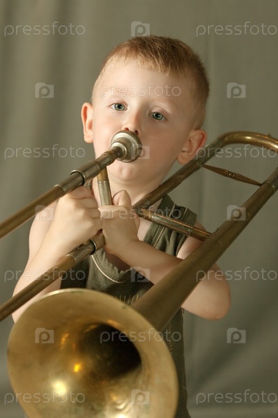 Маленький мальчик играет на трубе на сером фоне