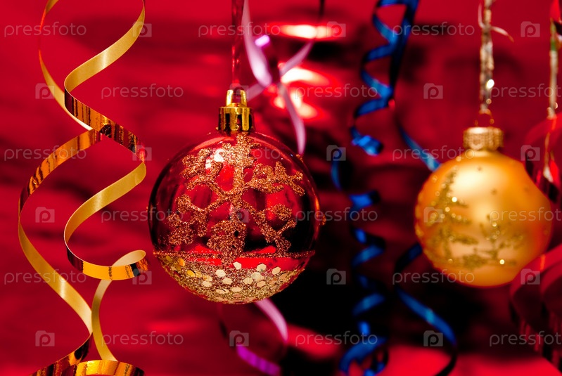 Разноцветные елочные шары и серпантинные ленты