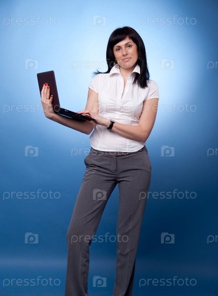 Молодая девушка с ноутбуком на голубом фоне