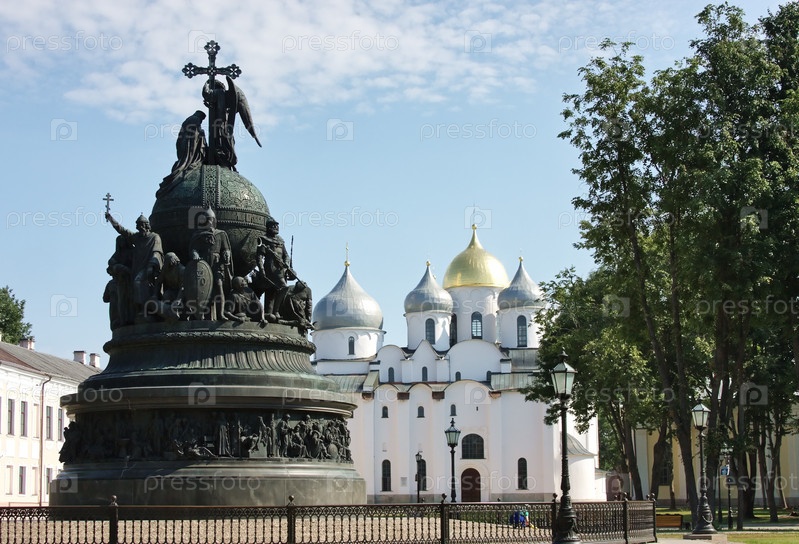 Памятник "Тысячелетие России" на фоне Софийского собора, город Великий Новгород