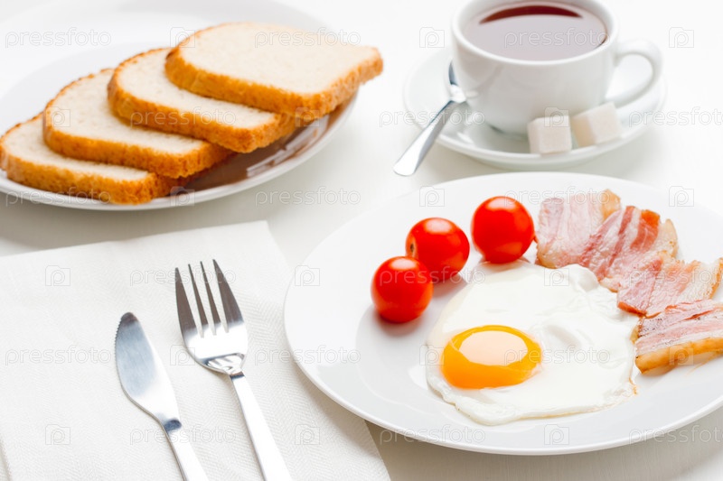 Английский завтрак с яичницей, беконом и помидорами