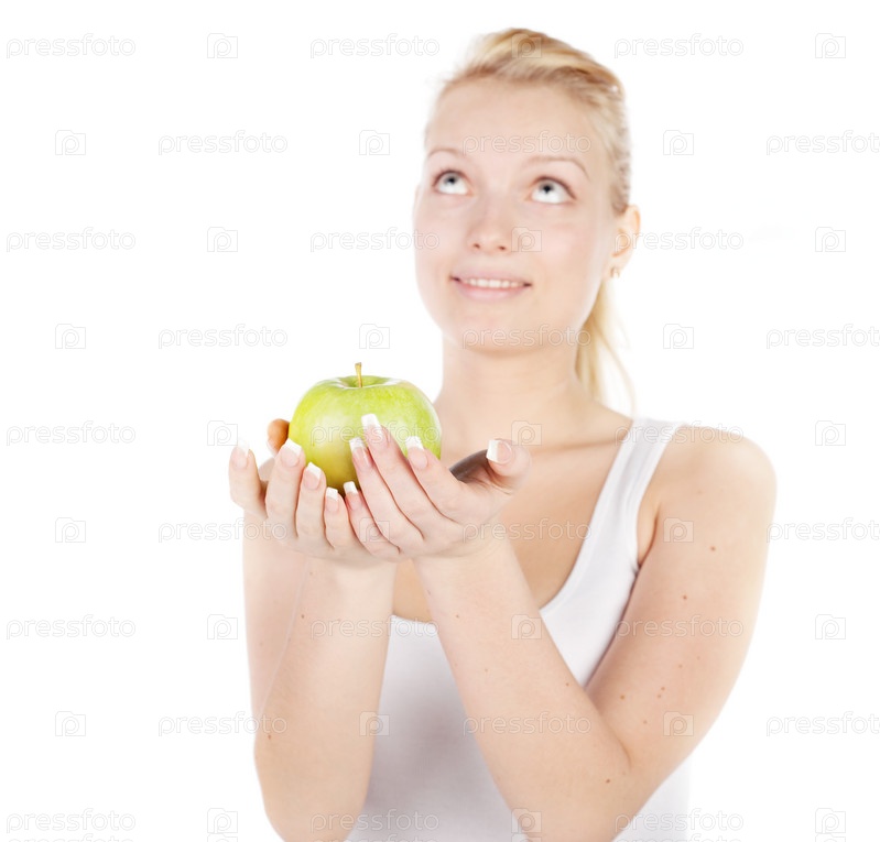 Молодая блондинка держит в руках яблоко и смотрит вверх