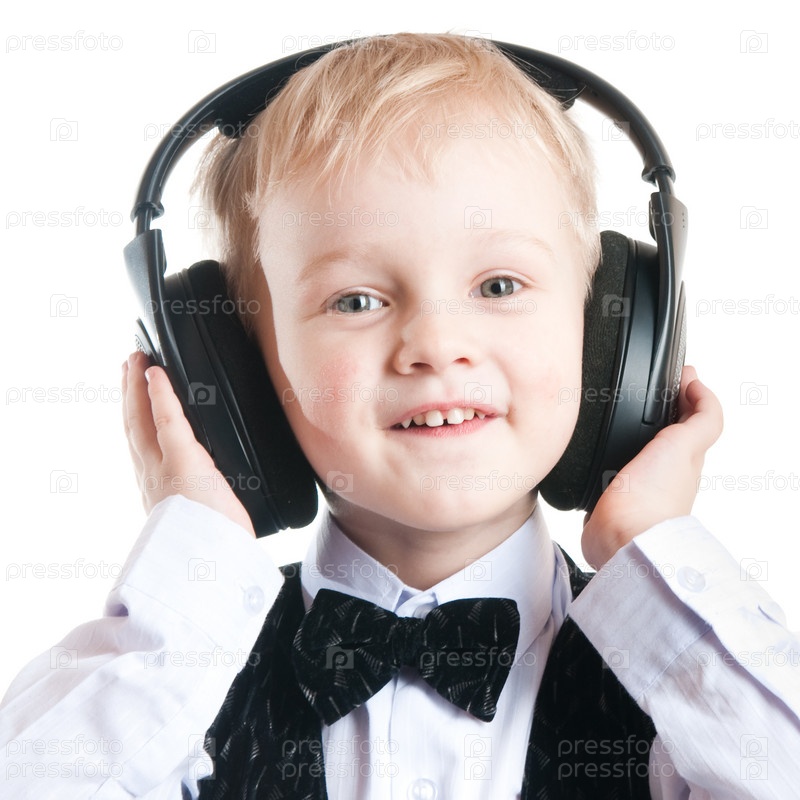 Маленький мальчик в наушниках на белом фоне
