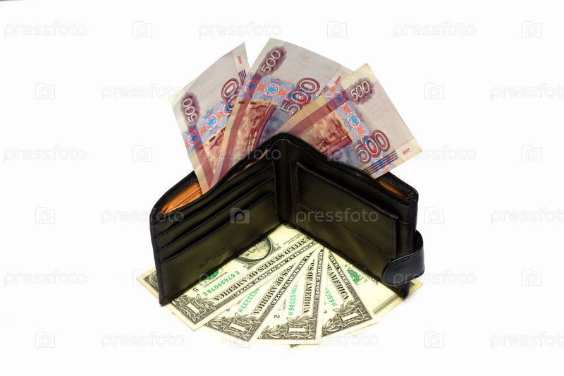 Кошелек с российскими деньгами на долларовых банкнотах