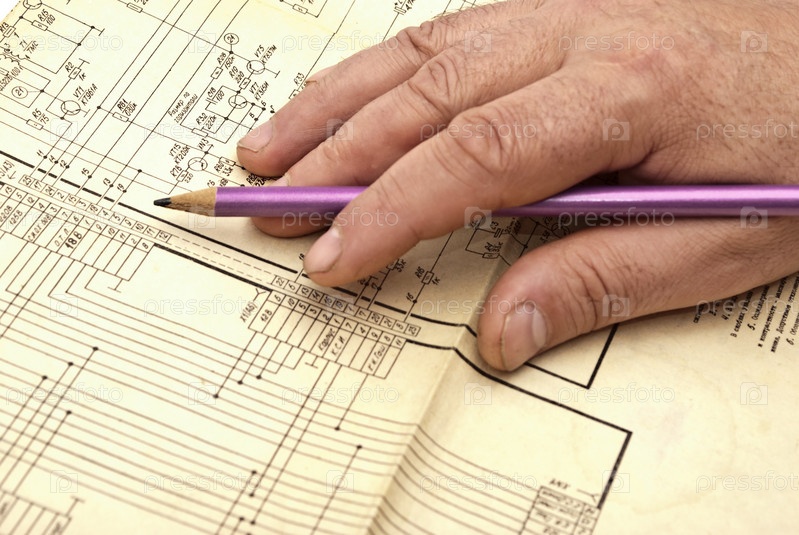 Мужская рука с карандашом на чертеже
