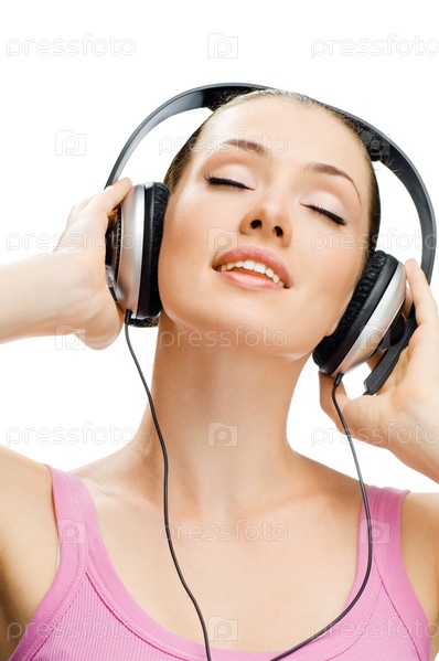 Девушка в наушниках на белом фоне