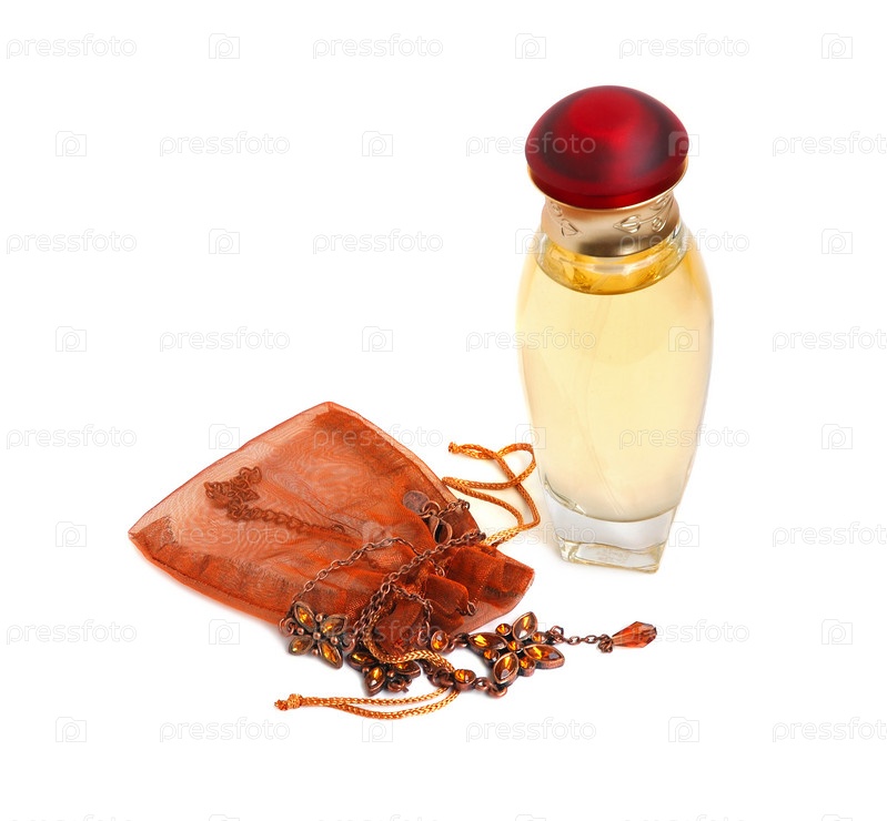 Парфюм и ожерелье изолировано на белом фоне