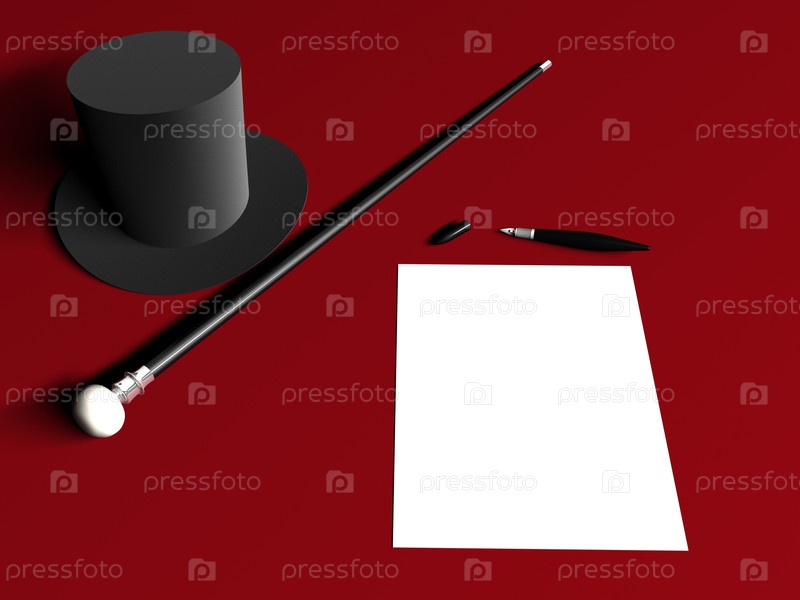 Шляпа, трость и листок бумаги с ручкой на красном фоне